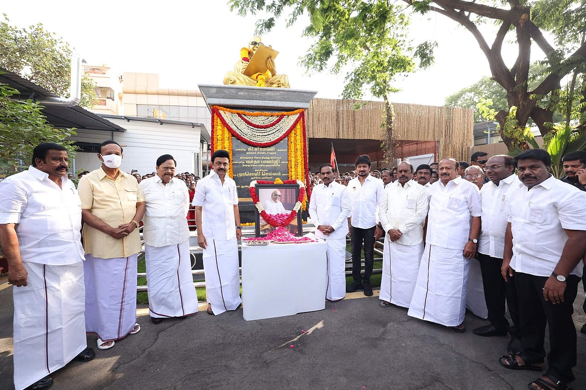 சென்னை அண்ணா அறிவாலயத்தில் உள்ள கருணாநிதி சிலைக்கு முதல்வர் மு.க.ஸ்டாலின் மரியாதை செலுத்தினார்.