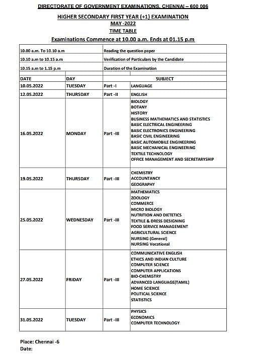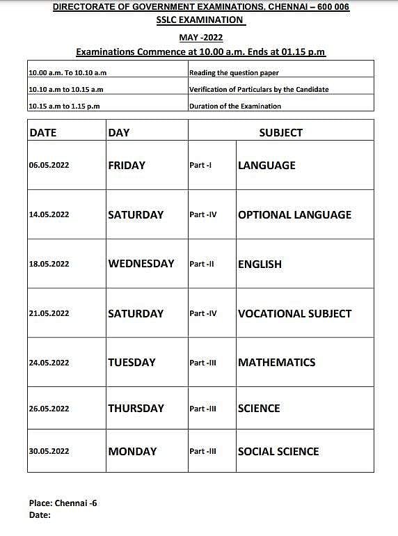 அதன்படி, பிளஸ் 2 பொதுத்தேர்வு மே 5 ஆம் தேதியும், பத்தாம் வகுப்பு பொதுத் தேர்வு மே 6 ஆம் தேதியும், 11 ஆம் வகுப்பு பொதுத்தேர்வு மே 9 ஆம் தேதியும் தொடங்குகிறது.
