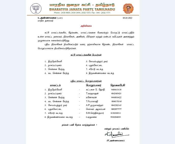 7 மாவட்டங்களிலும் தலைவர், நிர்வாகிகள், அணிகள், பிரிவுகள், மண்டல் கமிட்டிகள் என அனைத்தும் கலைக்கப்பட்டுள்ளது. சீரமைப்பு நடவடிக்கையாக அணிகள் கலைக்கப்பட்டு புதிய பொறுப்பாளர்கள் நியமிக்கப்பட்டுள்ளனர்.