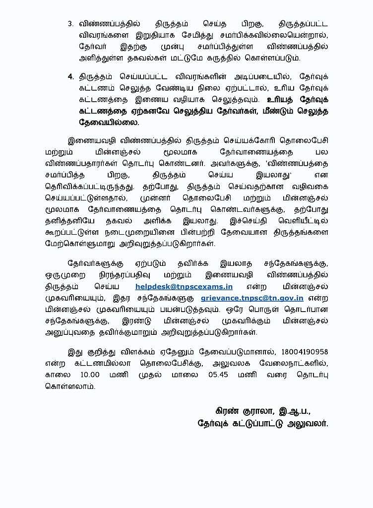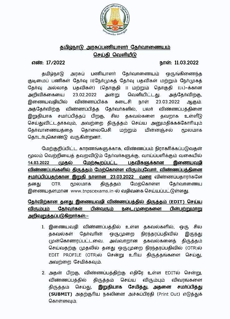டிஎன்பிஎஸ்சி குரூப் 2, 2ஏ தேர்வுகளுக்கு விண்ணப்பித்தவர்கள், விவரங்களை தவறாக உள்ளீடு செய்திருந்தால் வருகிற 14 ஆம் தேதி முதல் 23 ஆம் தேதி வரை திருத்தம் செய்துகொள்ளலாம் என்ற முக்கிய அறிவிப்பு வெளியாகியுள