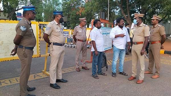 தூத்துக்குடியில் விமான நிலையத்தில் கைது செய்ய வந்த போலீஸாருடன் பேசும் திரைப்பட இயக்குநர் வ. கௌதமன்.