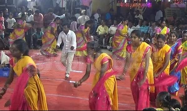 சித்திரை திருவிழாவை முன்னிட்டு நடைபெற்ற ஒயிலாட்ட நிகழ்ச்சியில் அசத்தலாக ஒயிலாட்டம் ஆடிய பெண்கள்.
