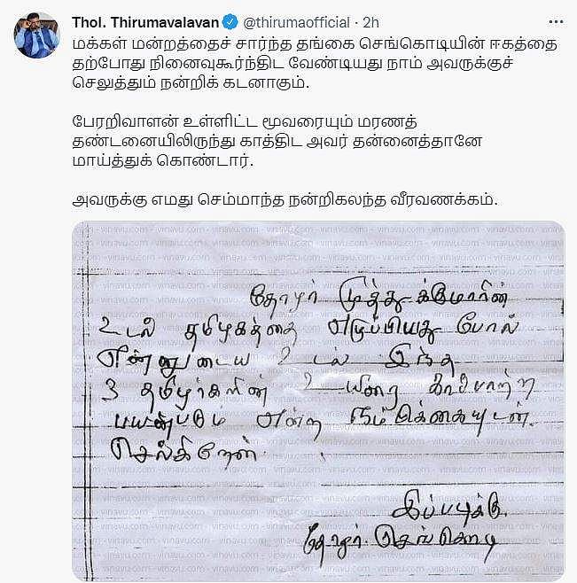 சென்னை: பேரறிவாளன் விடுதலையை தொடர்ந்து, செங்கொடியின் ஈகத்தை தற்போது நினைவுகூர்ந்திட வேண்டியது நாம் அவருக்குச் செலுத்தும் நன்றிக் கடன் என தொல்.திருமாவளவன் கூறியுள்ளார்.