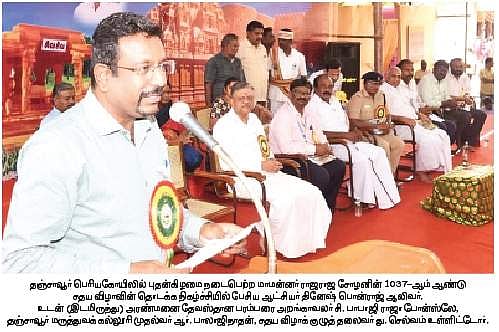 நிகழாண்டு ராஜராஜ சோழனின் 1037-ஆவது சதய விழா தஞ்சாவூா் பெரிய கோயிலில் புதன்கிழமை தொடங்கியது. தொடக்க நிகழ்ச்சியில் மாவட்ட ஆட்சியா் தினேஷ் பொன்ராஜ் ஆலிவா் பேசியது: