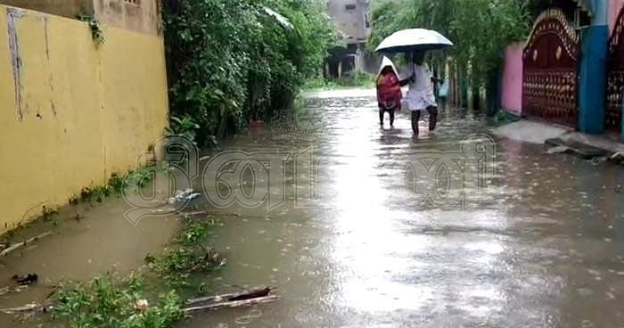 குடியிருப்பு நகர் பகுதி சாலைகளில் மழைநீர் தேங்கி வீடுகளையும் சூழ்ந்துள்ளது.