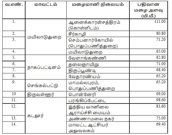 சென்னையில் கனமழை விபரம் (64.50 முதல் 115.5 மி.மீ. வரை)