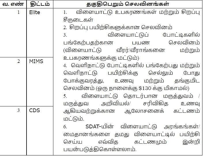 1. தலைசிறந்த விளையாட்டு வீரர்களுக்கான சிறப்பு உதவித்தொகை (ஒலிம்பிக்கில் இடம் பெற்றுள்ள விளையாட்டுக்கள் மட்டும்) (Special Scholarship for Elite Sports persons Scheme- ELITE)