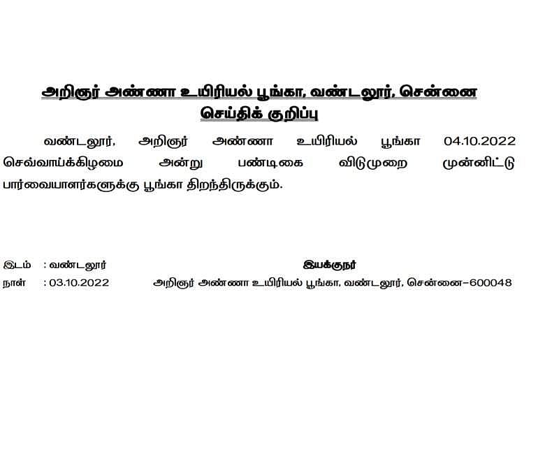 வண்டலூர் உயிரியல் பூங்கா நாளை(அக்.4) திறந்திருக்கும்!