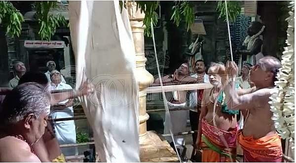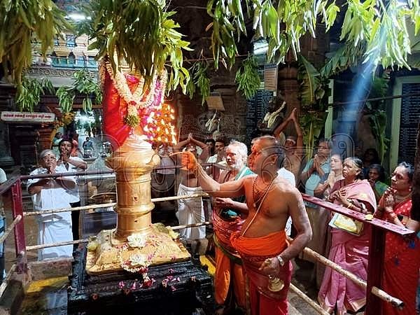 கொடிமரத்துக்கு தீபாராதனை காட்டப்படுகிறது.
