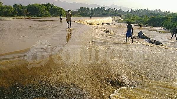 வழிந்தோடும் வெள்ளப்பெருக்கு நீரில் அந்த பகுதி இளைஞர்கள்.