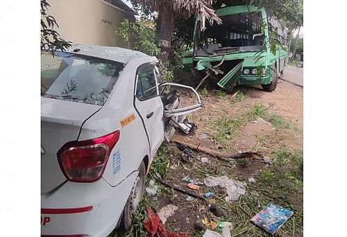 இதன் காரணமாக நிலைகுலைந்த பேருந்து வாலாஜாபேட்டையில் இருந்து சோளிங்கரை நோக்கி வந்த இரண்டு கார் மீது மோதி விபத்துக்குள்ளானது.