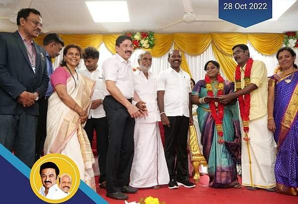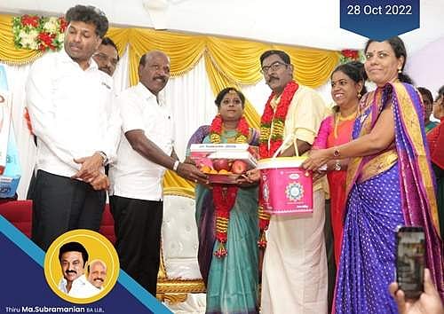 மணமக்களுக்கு பரிசு வழங்கிய அமைச்சர் மா.சுப்பிரமணியன்.