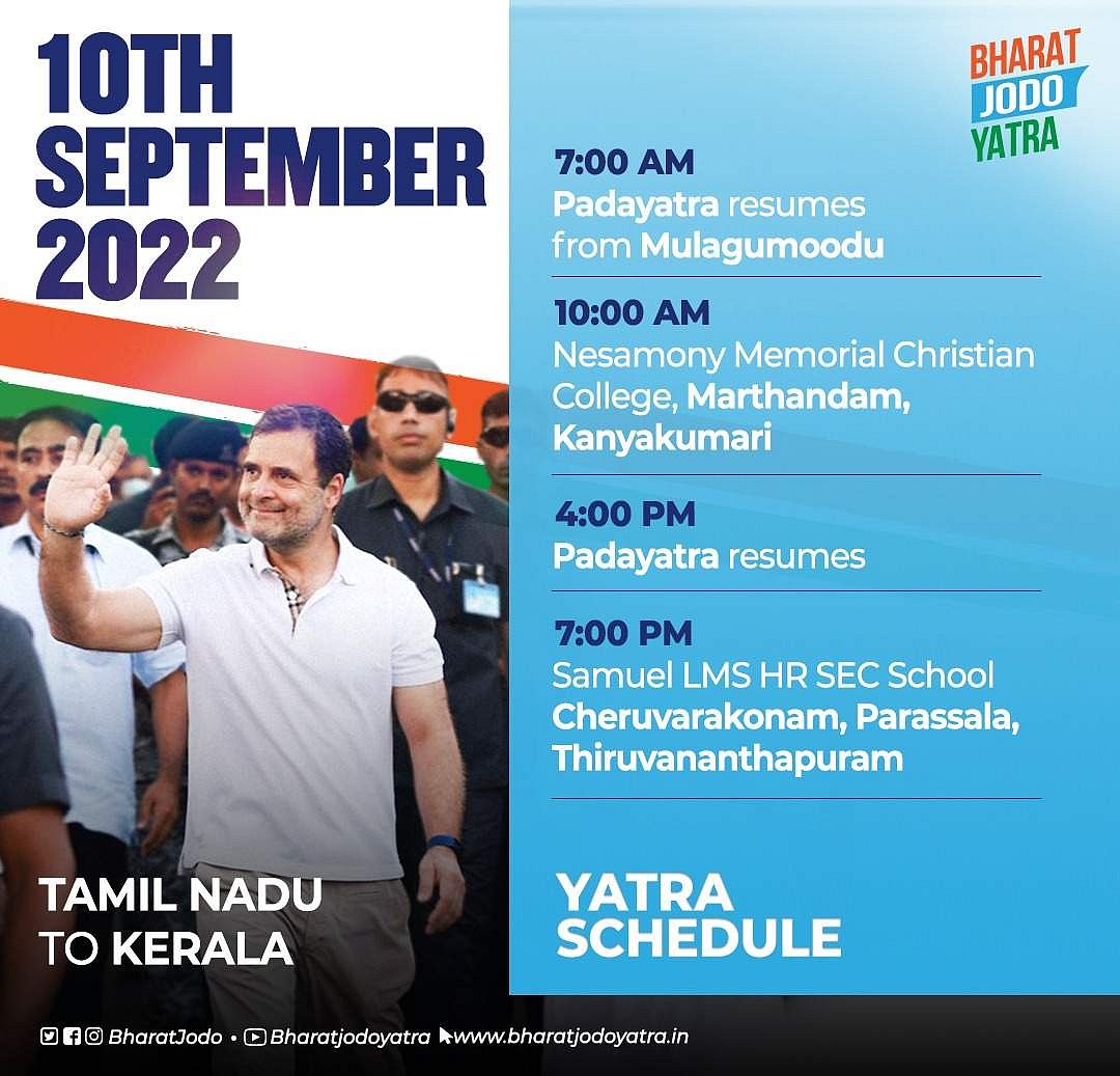 தமிழகத்தில் செப். 10 வரை மொத்தம் 56 கி.மீ., கேரளத்தில் 17 நாள்கள், கா்நாடகத்தில் 21 நாள்கள், தெலங்கானாவில் 13 நாள்கள், ஆந்திரத்தில் 3 நாள்கள் என தென்மாநிலங்களில் பயணம் மேற்கொள்கின்றனர்.