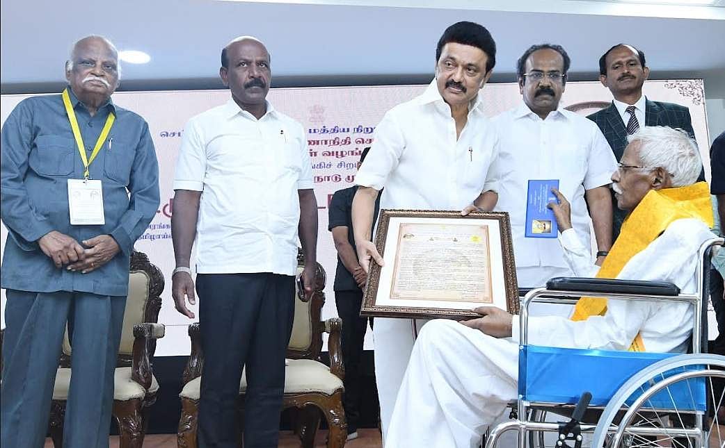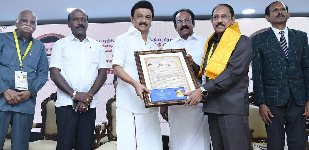 2020-ஆம் ஆண்டிற்கான விருதினை முனைவர் ம. இராசேந்திரனுக்கு வழங்கினார் முதல்வர் ஸ்டாலின்.