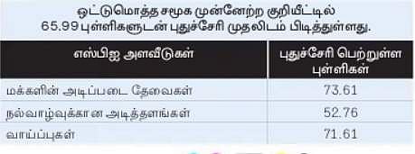 பிரதமருக்கான பொருளாதார ஆலோசனை கவுன்சில் வெளியிட்டுள்ள சமூக முன்னேற்ற குறியீட்டில் தனிநபா் உரிமைகள், தனிநபா் சுதந்திரம் உள்ளிட்டவை அடங்கிய வாய்ப்புகள் அளவீட்டில் தமிழ்நாடு முதலிடம் பிடித்துள்ளது. ஒட்டுமொத்த சமூக முன்னேற்ற குறியீட்டில் புதுச்சேரி முதலிடம் பிடித்துள்ளது.