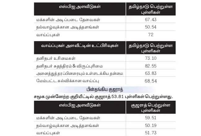 ஒட்டுமொத்த சமூக முன்னேற்ற குறியீட்டில் (எஸ்பிஐ) தமிழ்நாடு 63.33 புள்ளிகளுடன் 6-ஆவது இடம்பிடித்துள்ளது. இதில் வாய்ப்புகள் அளவீட்டில் 72 புள்ளிகளுடன் தமிழ்நாடு முதலிடம் பிடித்துள்ளது.