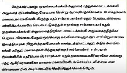 இந்த நிலையில் அரியலூர் மாணவி தற்கொலை தொடர்பாக நடத்தப்பட்ட விசாரணையில் மதம் தொடர்பான பரப்புரை எதுவுமில்லை என்று பள்ளிக்கல்வித்துறை அதிகாரிகள் விளக்கமளித்துள்ளனர்.
