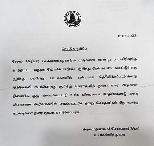 இந்நிலையில், பருவத் தேர்வில், சாதி குறித்து கேள்வி இடம்பெற்றது குறித்து விசாரிக்க, உயர்கல்வித் துறை உயர் அலுவலர் தலைமையில் குழு அமைக்கப்பட்டு உரிய விசாரணை மேற்கொண்டு அந்த விசாரணை அறிக்கையின் அடிப்படையில் தவறு செய்தவர்கள் மீது தகுந்த நடவடிக்கை துறை மூலமாக எடுக்கப்படும் என தமிழக அரசு தெரிவித்துள்ளது.