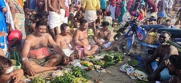 பூம்புகார் சங்கமத்தில் 1 லட்சத்திற்கும் மேற்பட்டோர் புனித நீராடி முன்னோர்களுக்கு தர்பணம்