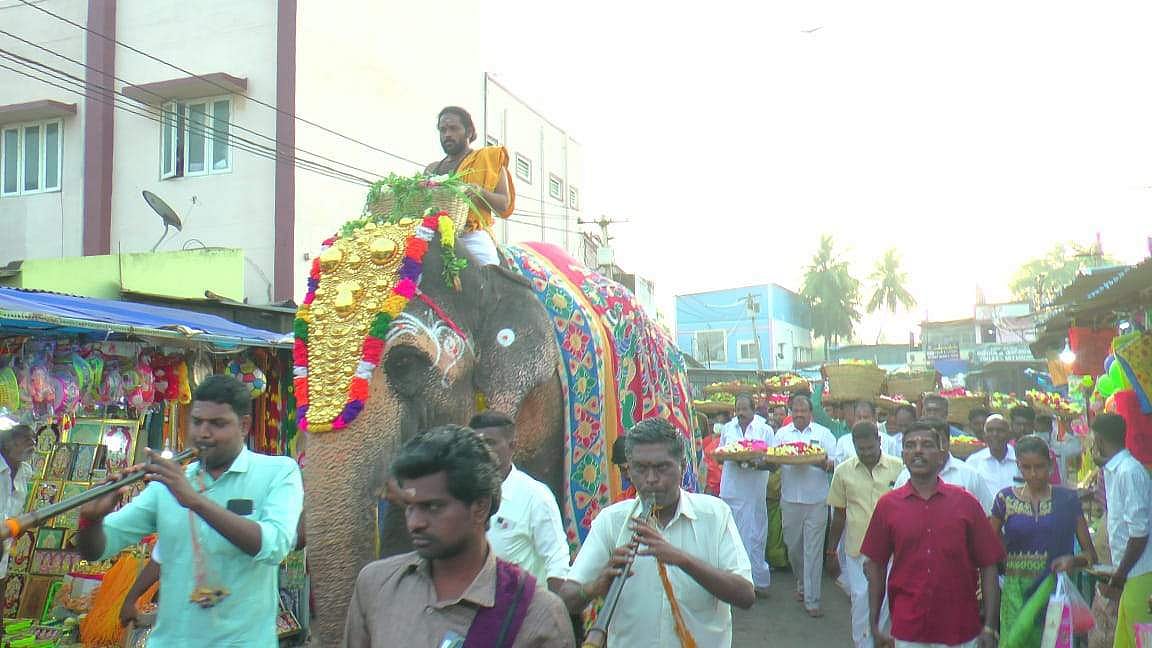 தொடர்ந்து கோயில் நிர்வாகம் சார்பில் பூத்தட்டை யானை மீது வைத்தும், கோயில் இணை ஆணையர் சி. கல்யாணி மற்றும் ஊழியர்கள் பூத்தட்டுகளைச் சுமந்தும் தேரோடும் வீதிகளில் ஊர்வலமாக வந்தனர்.