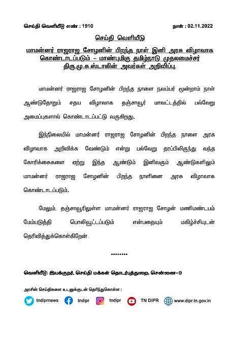 இந்நிலையில், மாமன்னர் ராஜராஜ சோழனின் பிறந்த நாளை அரசு விழாவாக அறிவிக்க வேண்டும் என்று பல்வேறு தரப்பிலிருந்து வந்த கோரிக்கைகளை ஏற்று இந்த ஆண்டும் இனிவரும் ஆண்டுகளிலும் மாமன்னர் ராஜராஜ சோழனின் பிறந்த நாள் அரசு விழாவாகக் கொண்டாடப்படும்.