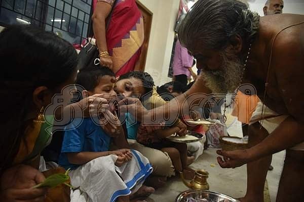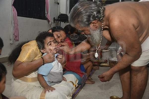 குழந்தையின் நாவில் ஹரி ஸ்ரீ கணபதியே நமஹா என எழுதும் கிருஷ்ணா நம்பூதிரி