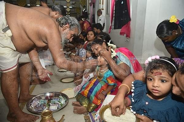 விஜயதசமி முன்னிட்டு சென்னை மகாலிங்கபுரம் ஐயப்பன் கோயிலில் ஷோபனா அரங்கில் புதன்கிழமை நடைபெற்ற வித்யாரம்பம் நிகழ்ச்சியில் ஐயப்பன் மேல் சாதத்தில் கிருஷ்ணா நம்பூதிரி குழந்தையின் நாவில் ஹரி ஸ்ரீ கணபதியே நமஹா என எழுதியும் பச்சரியில் முதல் எழுத்தை குழந்தையின் விரலை பிடித்து எழுதியும் தொடங்கி வைத்தார்.