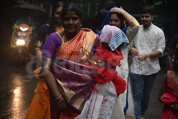 மழையில் குழந்தையுடன் வித்யாரம்பம் நிகழ்ச்சியில் பங்கேற்க வரும் பெற்றோர்கள்.