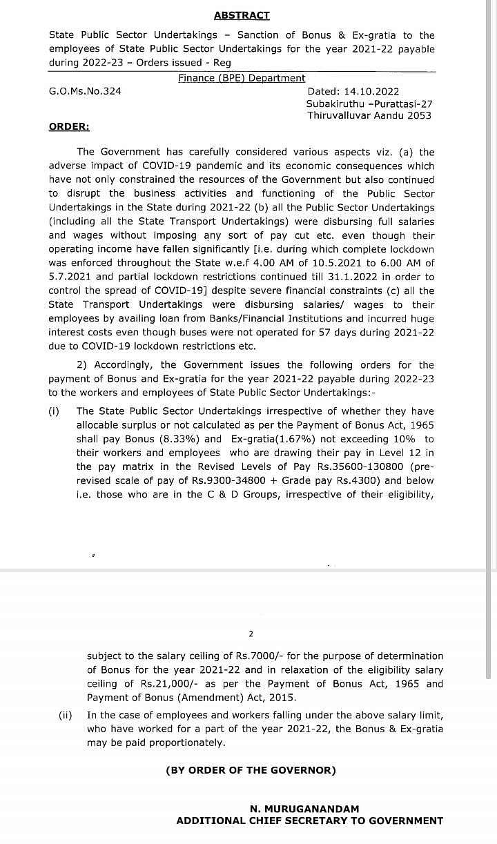 அரசின் சி மற்றும் டி பிரிவு தொழிலாளர்கள் மற்றும் பணியாளர்களுக்கு 8.33% போனஸ் மற்றும் 1.67% கருணைத் தொகை என மொத்தம் 10% போனஸ் வழங்க அரசாணை வெளியிடப்பட்டுள்ளது.