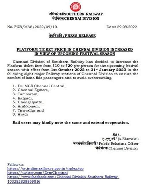 இதன்படி, ரயில் நிலையங்களில் ரூ.10 ஆக இருந்த நடைபாதை டிக்கெட் விலை தற்போது ரூ.30 ஆக உயர்த்தப்பட்டுள்ளது.