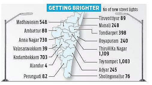 சென்னை முழுவதும் 5,594 தெரு விலக்குகள் மற்றும் 85 உயர் மட்ட விளங்குகள் அமைக்க ரூ.33.57 கோடி ஒதுக்கப்பட்டுள்ளது. தற்போது, சென்னை முழுவதும் 2,91,415 எல்இடி தெரு விளக்குகள் பொருத்தப்பட்டுள்ளன. இதனை சென்னை மாநகராட்சியின் மின்துறை பராமரித்து வருகிறது.