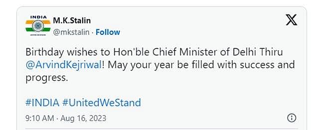 தில்லி முதல்வர் அரவிந்த் கேஜரிவால் இன்று தனது 55வது பிறந்த நாளை கொண்டாடுகிறார். இதையொட்டி அவருக்கு முதல்வர் ஸ்டாலின் பிறந்த நாள் வாழ்த்துகள் தெரிவித்துள்ளார்.