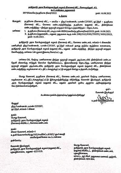 பணி மாறுதல் வழங்கக்கோரி 6 மாத குழந்தையை, அமைச்சர் சிவசங்கர் காலடியில் வைத்து கோரிக்கை வைத்த அரசுப் பேருந்து ஓட்டுநர் கண்ணன் சொந்த ஊரான தேனிக்கு பணியிட மாற்றம் செய்யப்பட்டுள்ளார்.