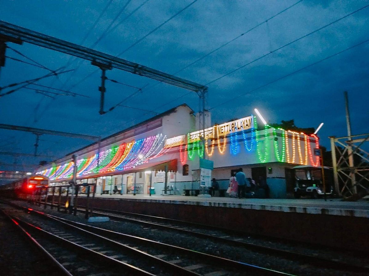 மேட்டுப்பாளையம் ரயில் நிலையம் துவங்கப்பட்டு 150 ஆண்டுகள் நிறைவடைவதையொட்டி ரயில் நிலையம் மின் விளக்குகளால் அலங்கரிக்கப்பட்டுள்ளது.