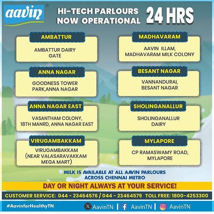 இதுகுறித்து அவர் தனது ட்விட்டர் பக்கத்தில், 'ஆவின் வரலாற்றில் முதன்முறையாக பொதுமக்களின் தேவையை பூர்த்தி செய்ய கீழ்கண்ட ஆவின் பார்லர்கள் இன்று முதல் தேவைக்கேற்ப (சில நாட்கள்)24 மணி நேரமும் செயல்படும். ஆவின் பால், பால் பவுடர் மற்றும் பால் உப பொருள்கள் எப்போதும் கிடைக்கும் வகையில் ஏற்பாடு செய்யப்பட்டுள்ளது' என்று தெரிவித்துள்ளார்.