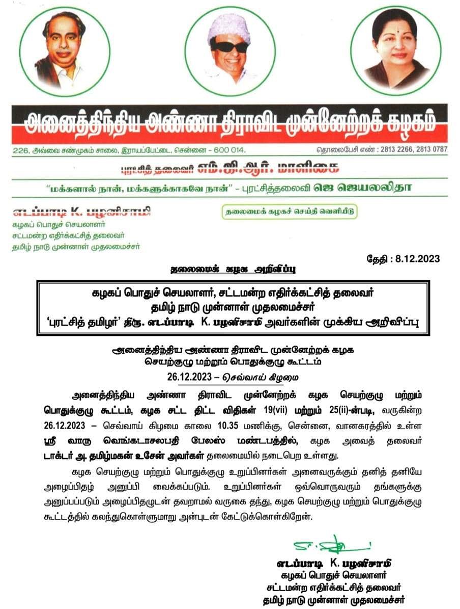 டிச. 26ல் அதிமுக பொதுக்குழு, செயற்குழுக் கூட்டம்!
