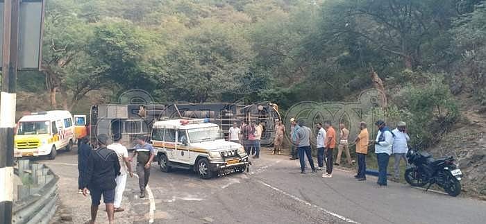ஒகேனக்கல் கணவாய் ஆஞ்சநேயர் கோயில் பகுதியில் சாலையில் கவிழ்ந்து விபத்துக்குள்ளான சுற்றுலா பேருந்து.