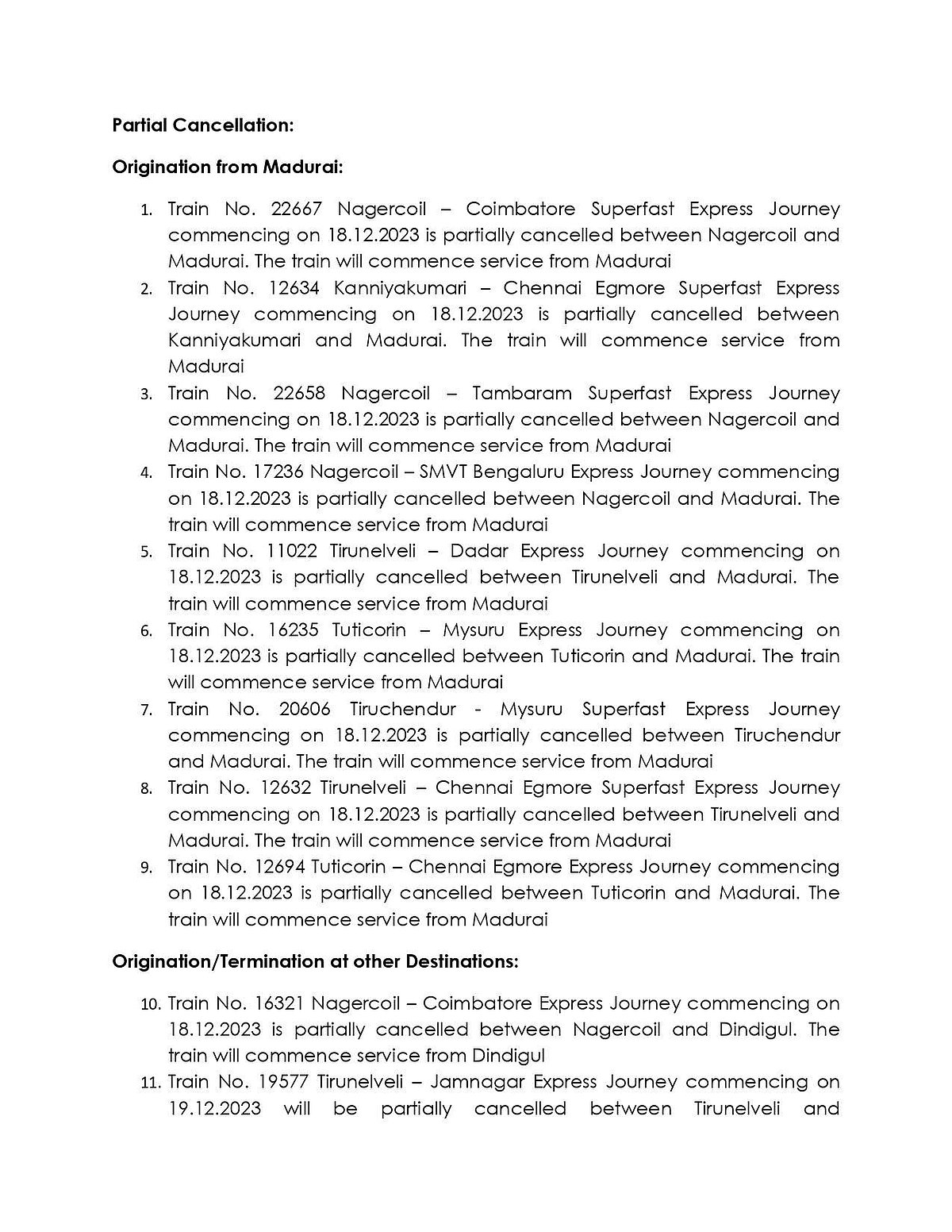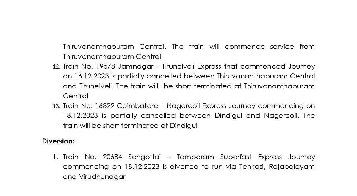 இதன்காரணமாக, நெல்லை – சென்னை வந்தே பாரத், திருச்செந்தூர் – பாலக்காடு, நெல்லை – ஜாம் நகர், நிஜாமுதீன் ரயில், சென்னை - திருச்செந்தூர்(20605), திருவனந்தபுரம் - திருச்சி விரைவு ரயிலும்(22628) ஆகிய ரயில்கள் ரத்து செய்யப்படுவதாக தெற்கு ரயில்வே அறிவித்திருந்தது.