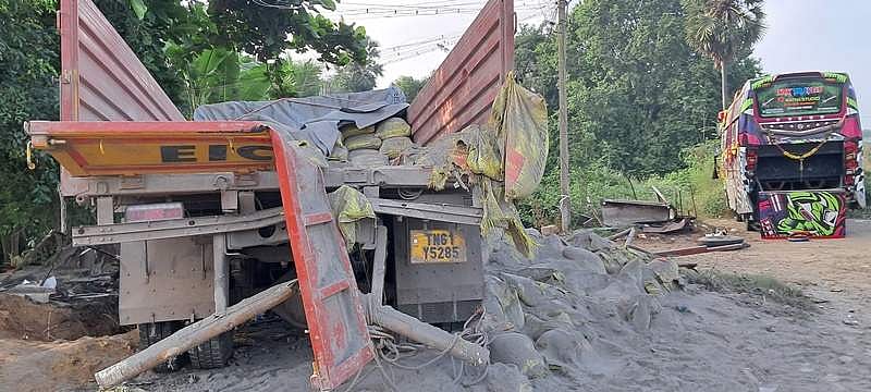 திருமயம் அருகே நமணசமுத்திரம் காவல்நிலையம் எதிரே வெள்ளிக்கிழமை நள்ளிரவில் நேரிட்ட விபத்தில் சிக்கிய சிமெண்ட் லாரி மற்றும் ஐயப்ப பக்தர்கள் சென்ற வேன்.