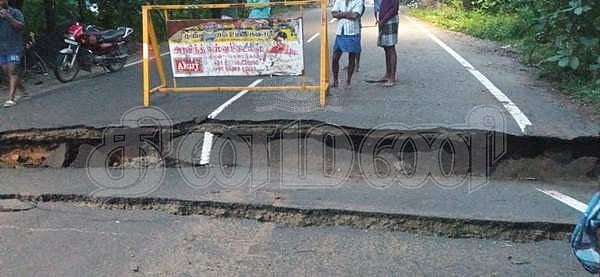 திருநள்ளாறு அருகே தாமனாங்குடி கிராமத்தில் பிரதான சாலையின் குறுக்கே இருந்து உடைந்த வாய்க்கால் பாலம்.