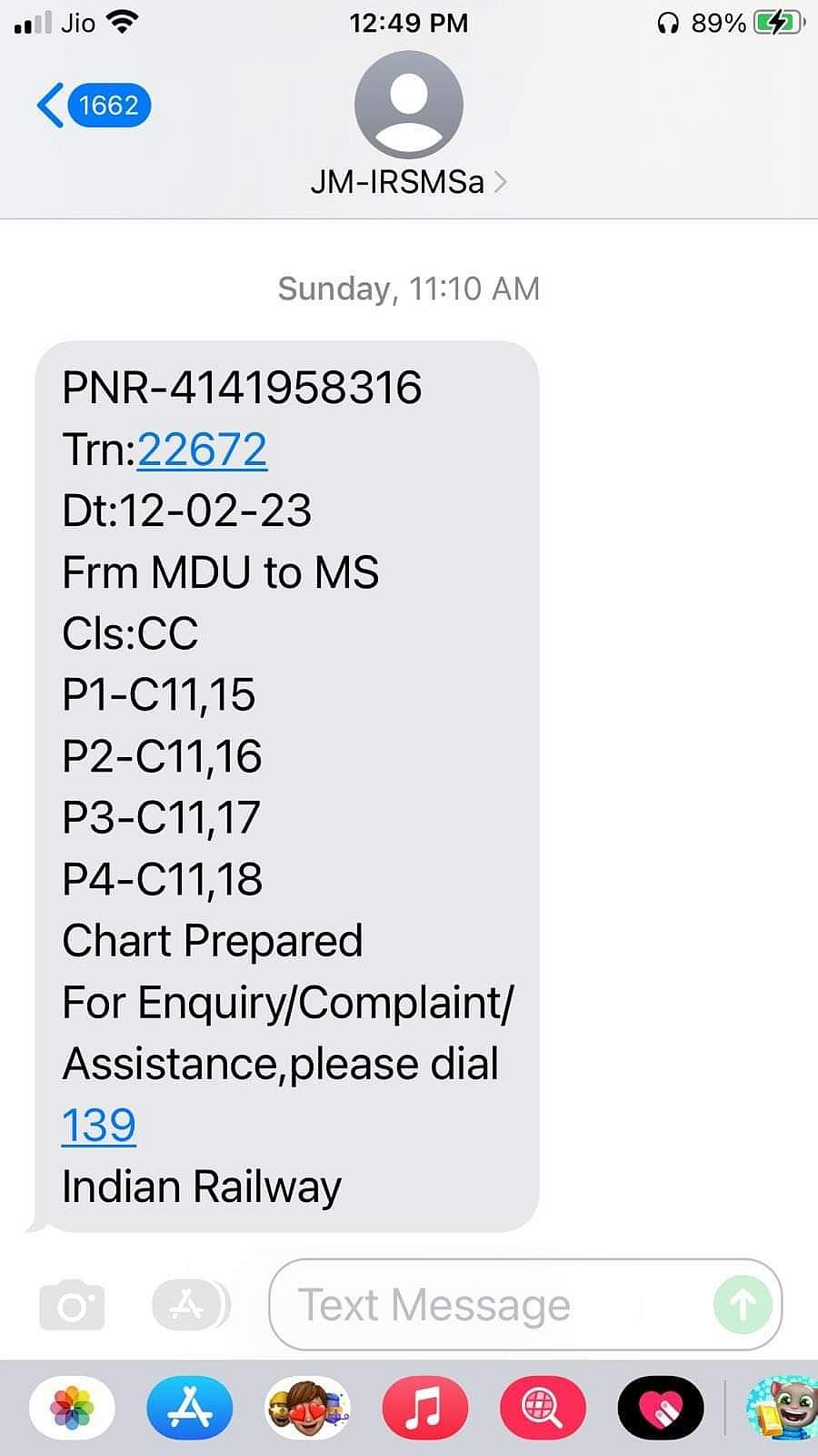 அன்று காலை 11 மணிக்கு, சார்ட் தயாரிக்கப்பட்ட எஸ்.எம்.எஸ். செய்தியும் நண்பருக்கு வந்தது. அதில் ரயில் புறப்படும் நேரம் மாலை 3.00 மணி எனவும், மதுரையிலிருந்து சென்னை பயணம் என்றும் இருந்தது. நான் அவர்களை எனது காரில் மதுரை ஜங்சனில் 2.30 மணியளவில் சேர்த்தேன்.
