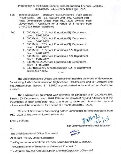 தமிழ்நாட்டில் பள்ளிகளில் பணியாற்றி வரும் 912 தற்காலிக ஆசிரியர்களுக்கு மூன்று மாதங்கள் தொடர் நீட்டிப்பு வழங்கி பள்ளிக் கல்வித் துறை ஆணையர் உத்தரவிட்டுள்ளார்.