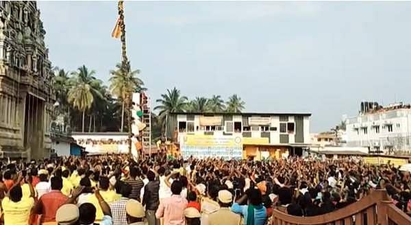 ஆனைமலை மாசாணியம்மன் கோயில் குண்டம் திருவிழா கொடியேற்றத்துடன் இன்று தொடங்கப்பட்ட நிலையில், ராஜகோபுரம் அருகே 85 அடி உயரமுள்ள கொடிக்கம்பம் நடப்பட்டது.