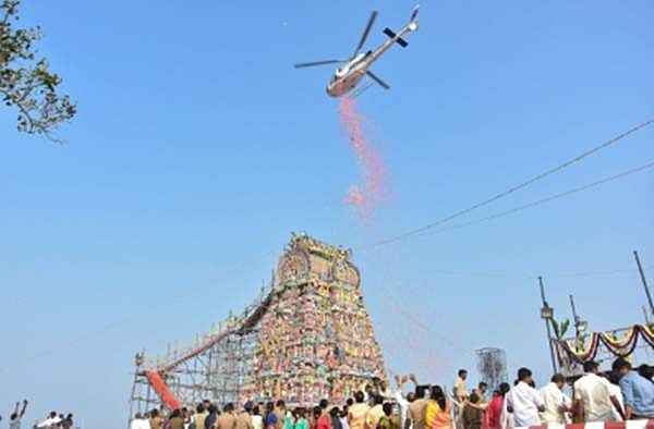குடமுழக்கு விழாவையொட்டி ராஜகோபுரம் மற்றும் தங்க கோபுரத்திற்கு ஹெலிகாப்டர் மூலமாக மலர் தூவப்பட்டது. பக்தர்கள் மீது புனித நீர் படும் வகையில் தெளிப்பான் மூலம் புனித நீர் தெளிக்கப்பட்டது.