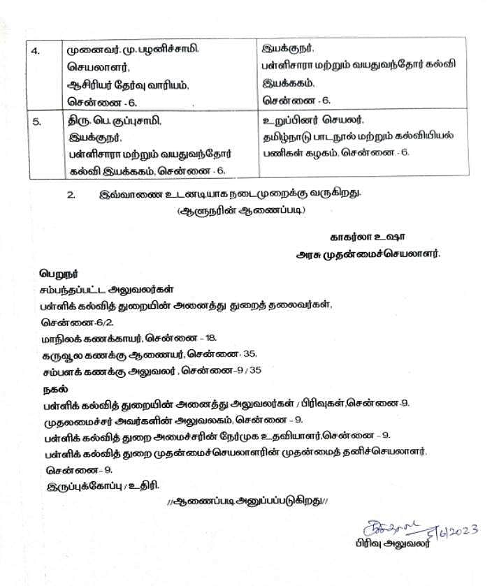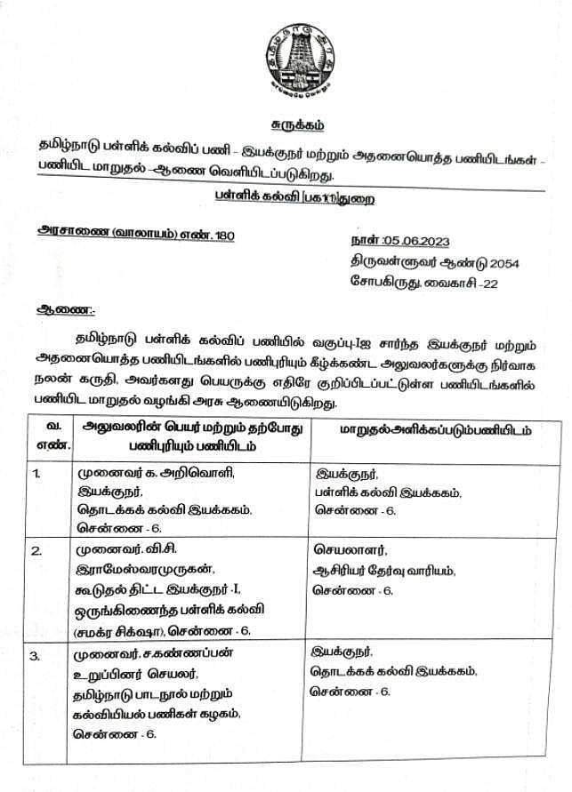 தொடக்கக் கல்வி இயக்குநராக அறிவொளி பள்ளிக் கல்வி இயக்குநராக நியமிக்கப்பட்டுள்ளார். ஆசிரியர் தேர்வு வாரிய செயலாளராக ராமேஸ்வர முருகன் நியமிக்கப்பட்டுள்ளார்.