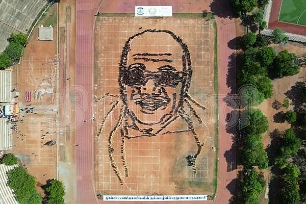இதில், 100 மீட்டர் நீளம், 70 மீட்டர் அகலத்தில் 2752 தூய்மைப் பணியாளர்களைக் கொண்டு காலை 7.23 மணிக்கு தொடங்கி, 8.45 மணிக்குள் கருணாநிதி உருவம் வடிவமைக்கப்பட்டது.