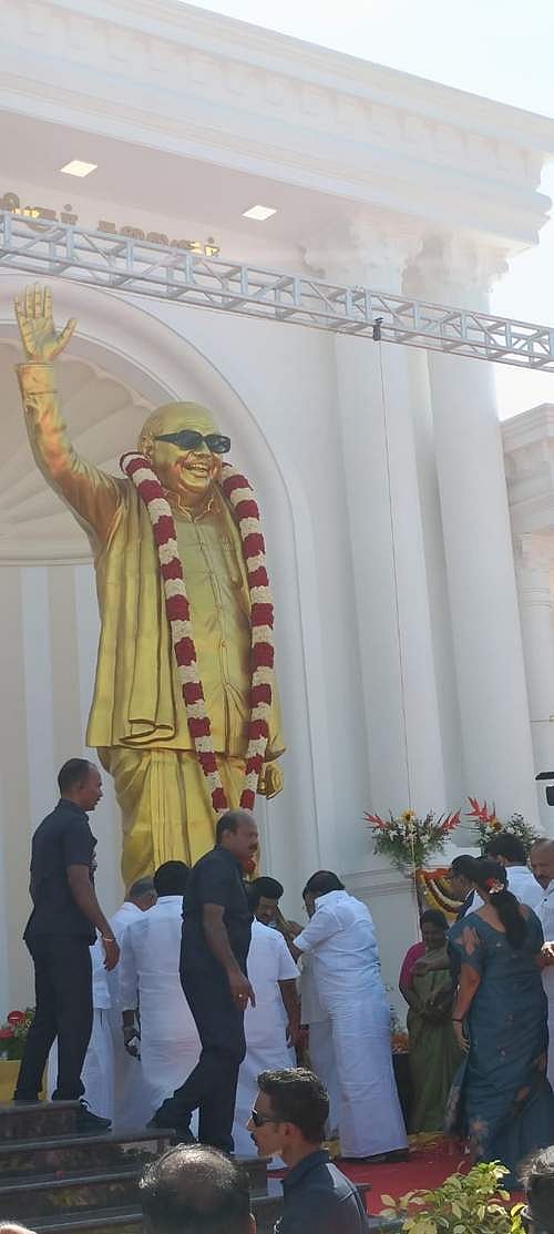 கருணாநிதியின் முழு உருவ வெண்கலச் சிலையை முதல்வர் மு.க.ஸ்டாலின் திறந்து வைத்தார். இதையடுத்து கருணாநிதி சிலைக்கு முதல்வர் மு.க. ஸ்டாலின் மலர் தூவி மரியாதை செலுத்தினார்.