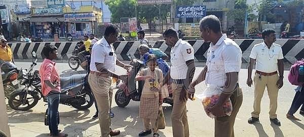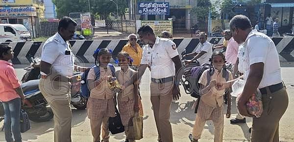 பள்ளிகள் திறப்பு: மாணவ,மாணவிகளுக்கு ரோஜாப்பூ, இனிப்புகள் வழங்கி வரவேற்ற போக்குவரத்து போலீசார்!