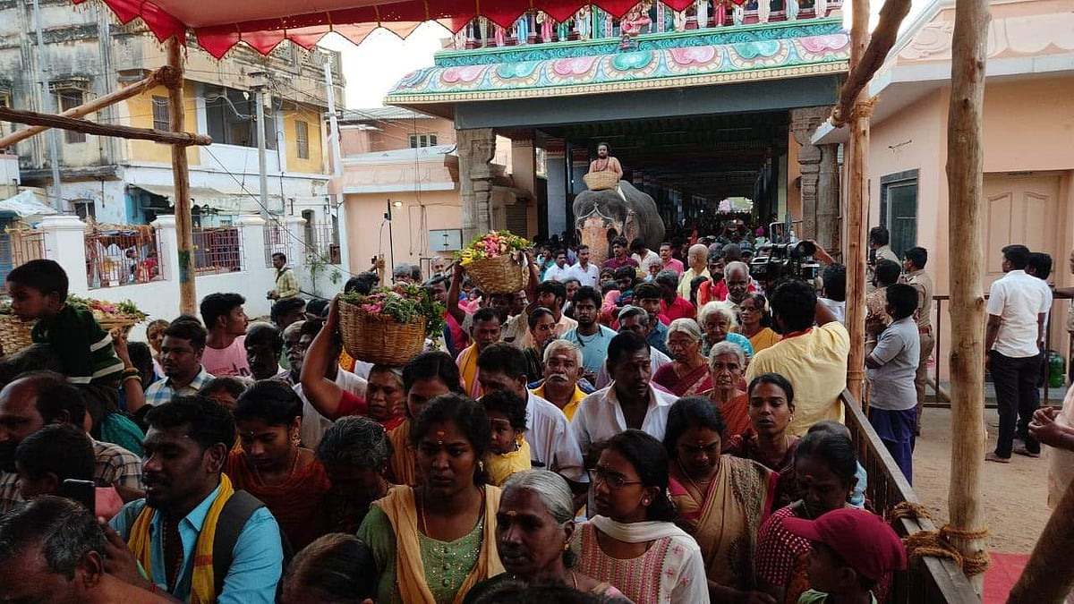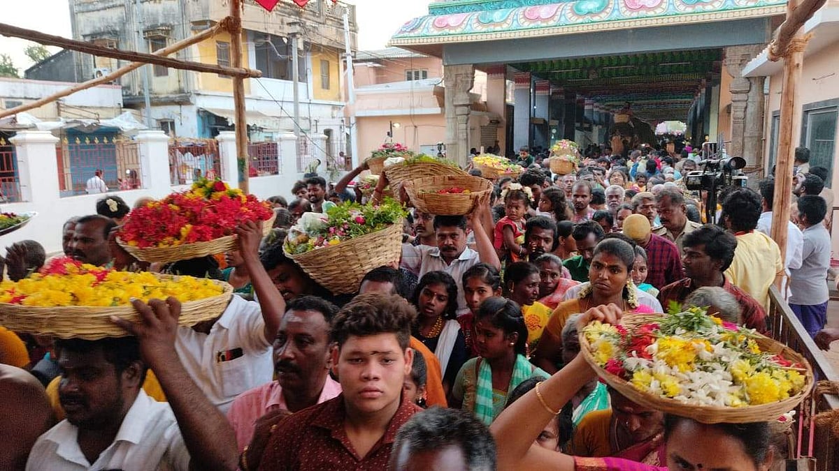 பிரசித்தி பெற்ற சமயபுரம் அருள்மிகு மாரியம்மன் திருக்கோயிலில் பூச்சொரிதல் விழா. யானை மீது பூக்கள் கொண்டு வரப்பட்டு பூச்சொரிதல் தொடங்கியது.
