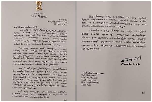 அவர் எழுதியுள்ள வாழ்த்து கடிதத்தில், காசி தமிழ் சங்கமத்தில் நீங்கள் ஆர்வத்தோடு பங்கேற்றது குறித்து உங்களது கடிதம் உண்மையிலேயே மகிழ்ச்சி அளிக்கிறது. வரலாற்றுச் சிறப்புமிக்க காசியில் தமிழர்களின் வளமையான கலாசாரம் மற்றும் பாராம்பரியத்தின் கொண்டாட்டத்தைக் காணும் இனிமையான அனுபவம் கங்கை, காவேரி போன்ற புனித நதிகளில் நீராடுவதைப் போன்றது.